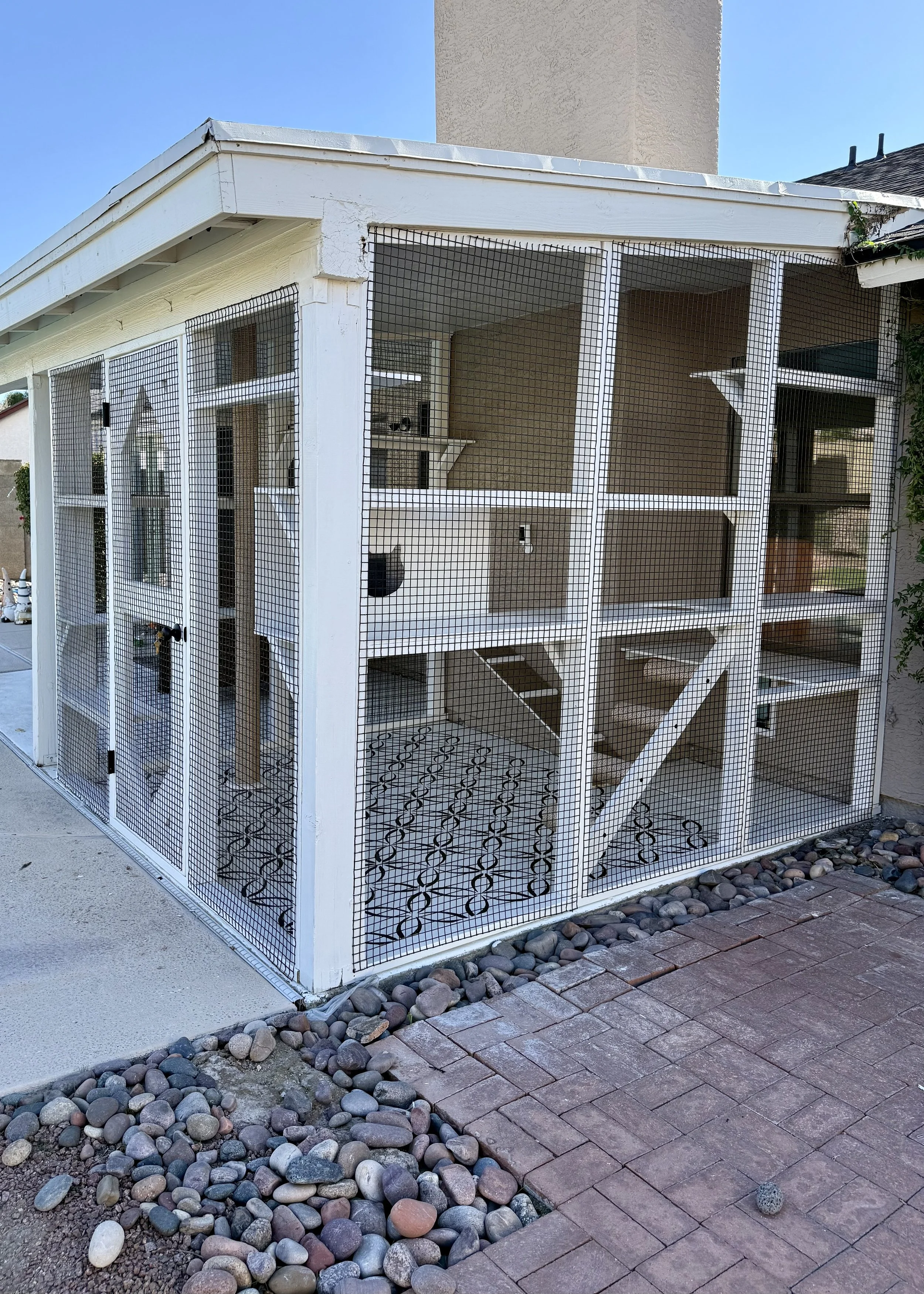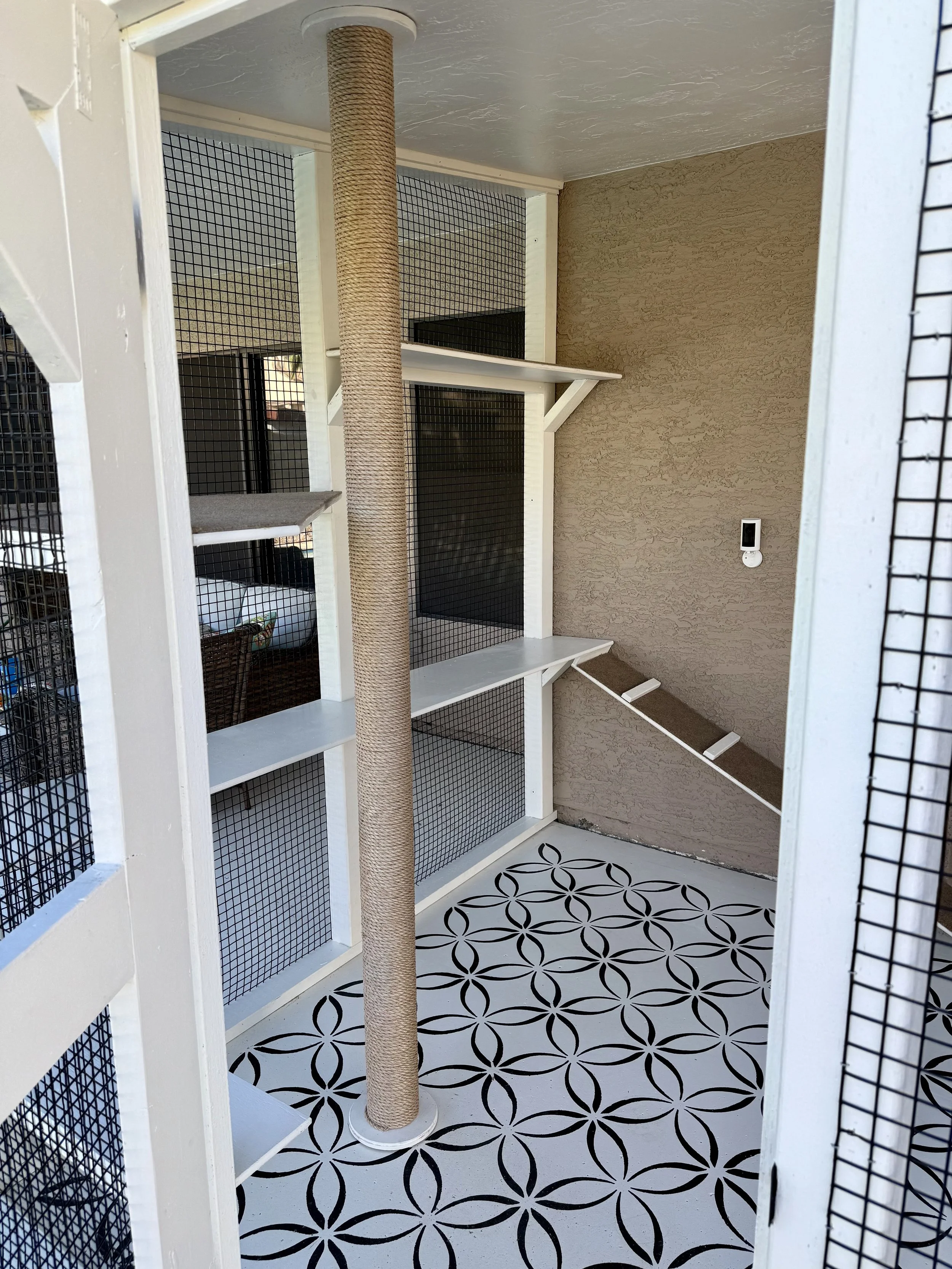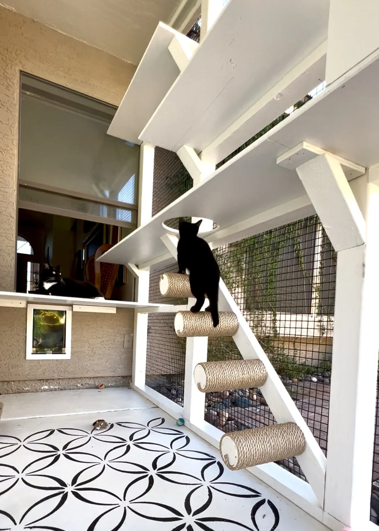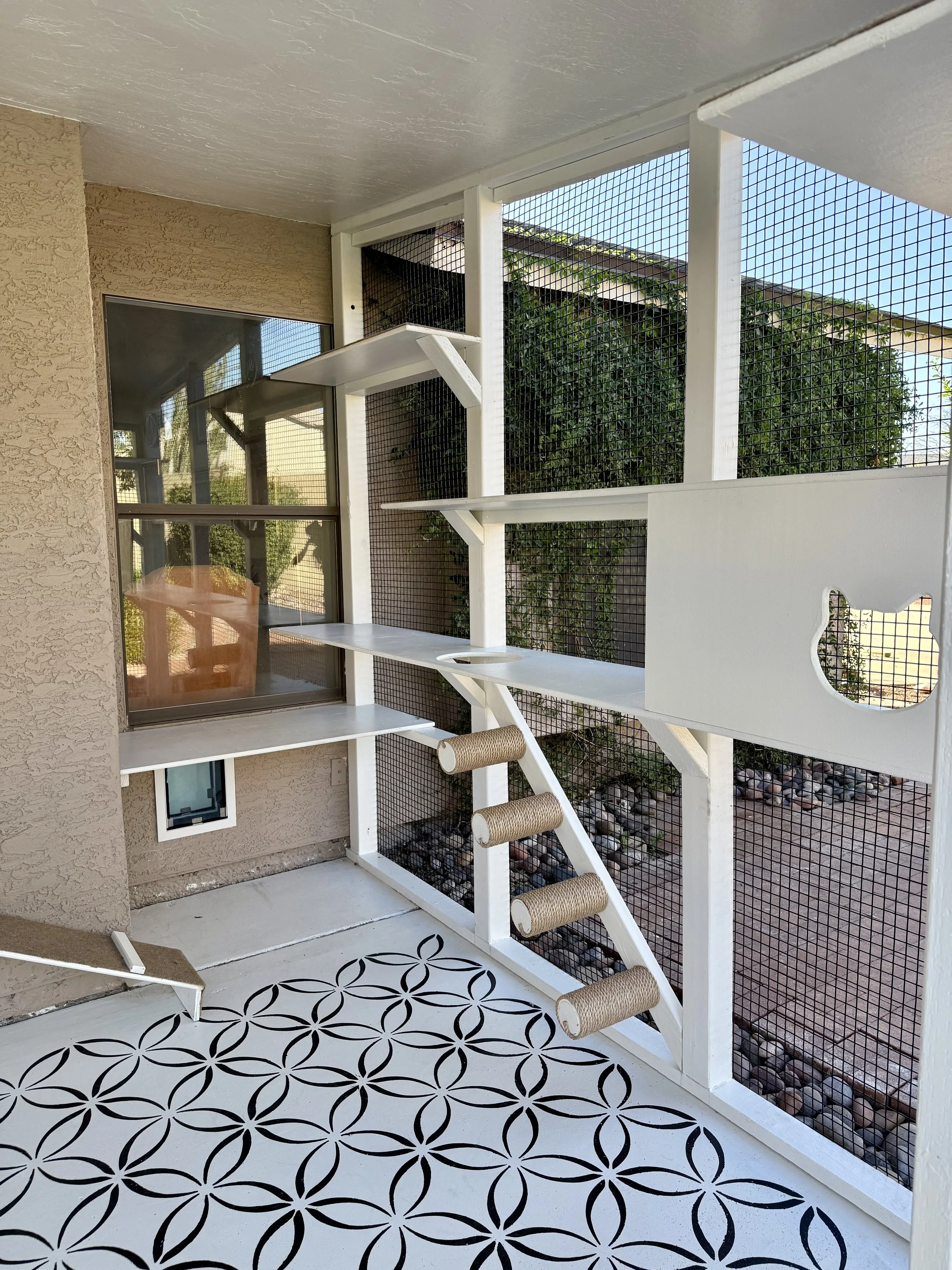This black and white catio was designed for five kitties (and one very lucky pup!). Our client added her own touch with that stunning hand-painted floor. We’re obsessed with how it ties the whole space together. Whether they’re climbing, lounging, or cat walking across their new playground, this crew has it made in their chic pad!