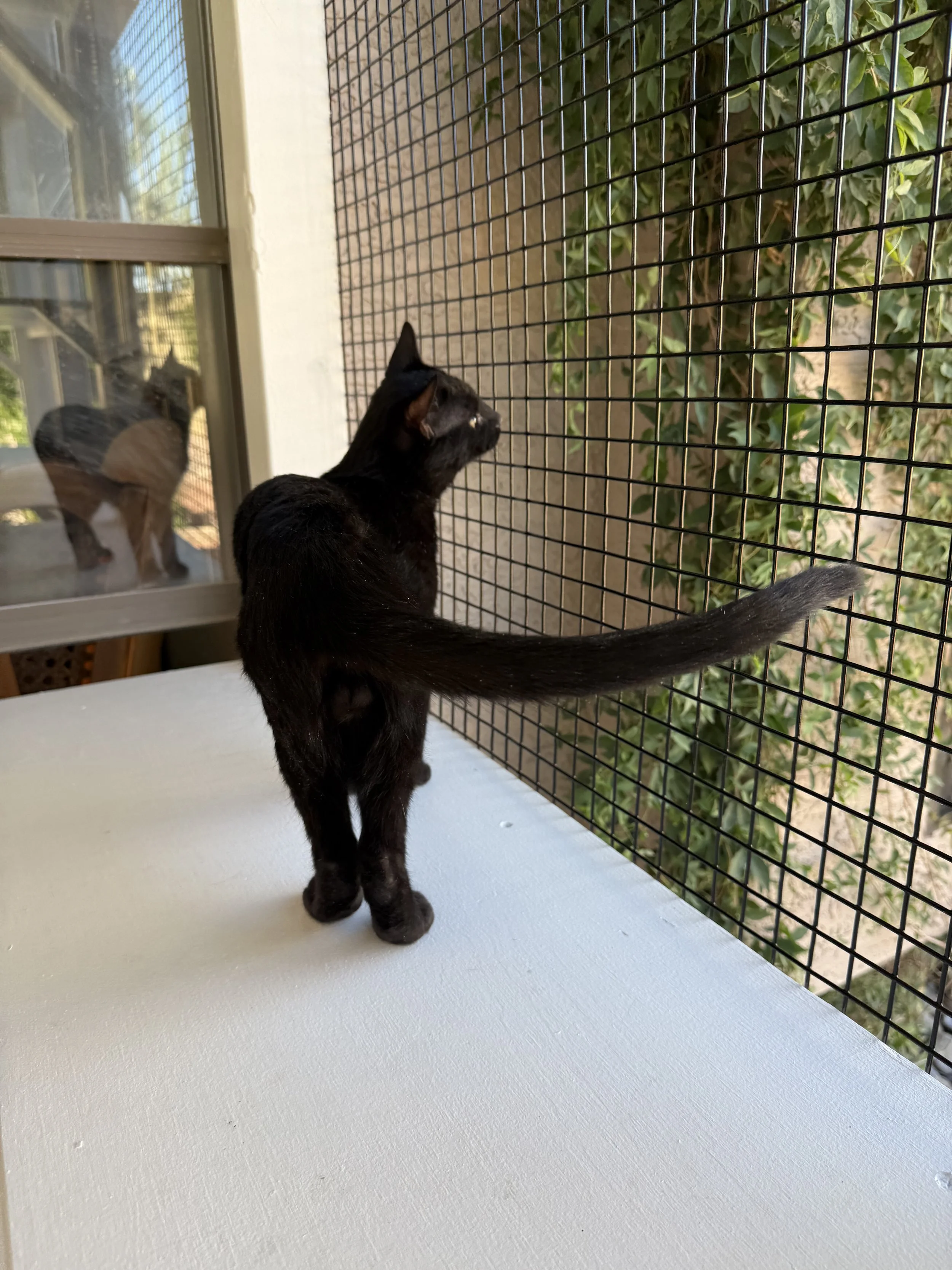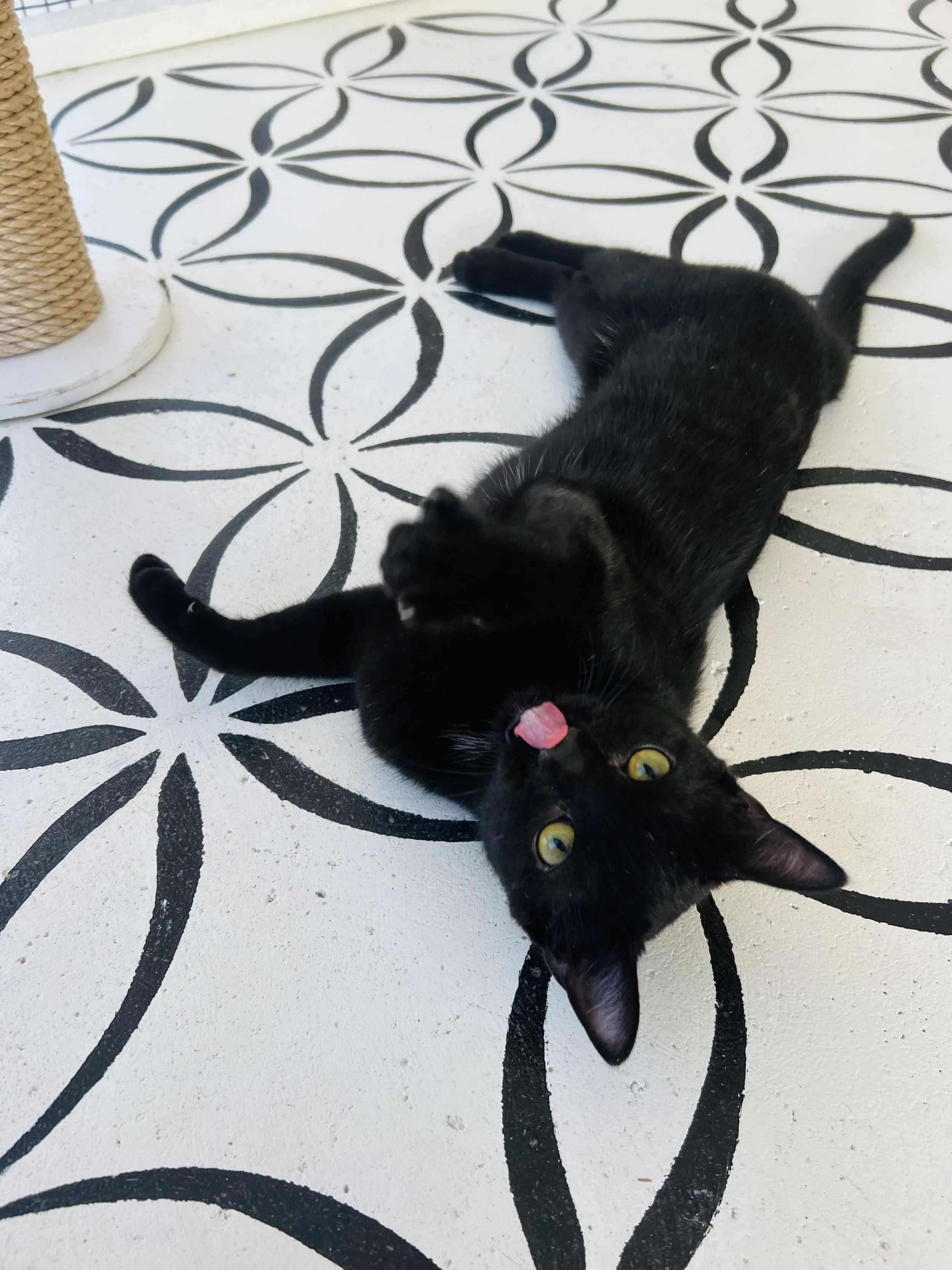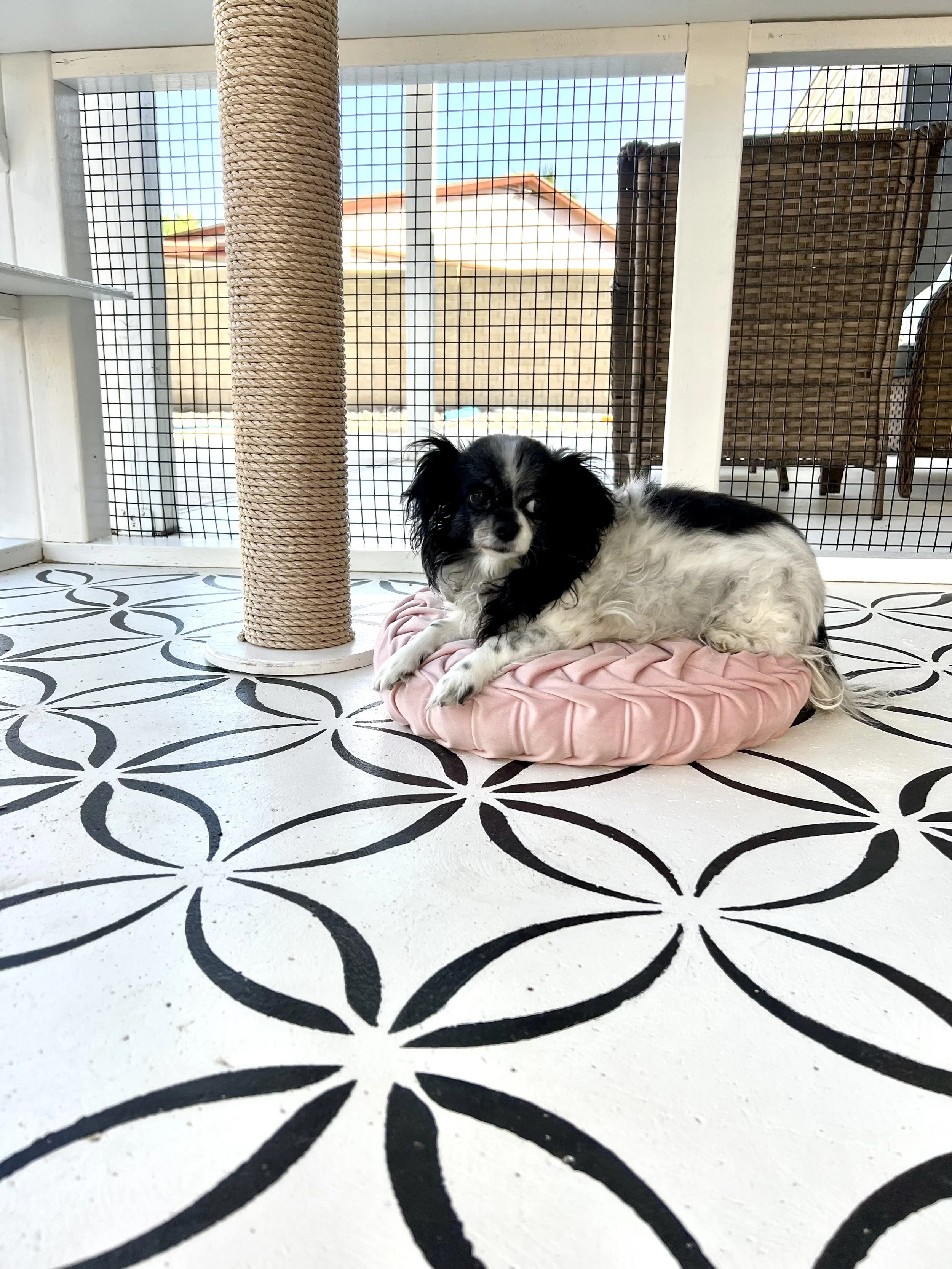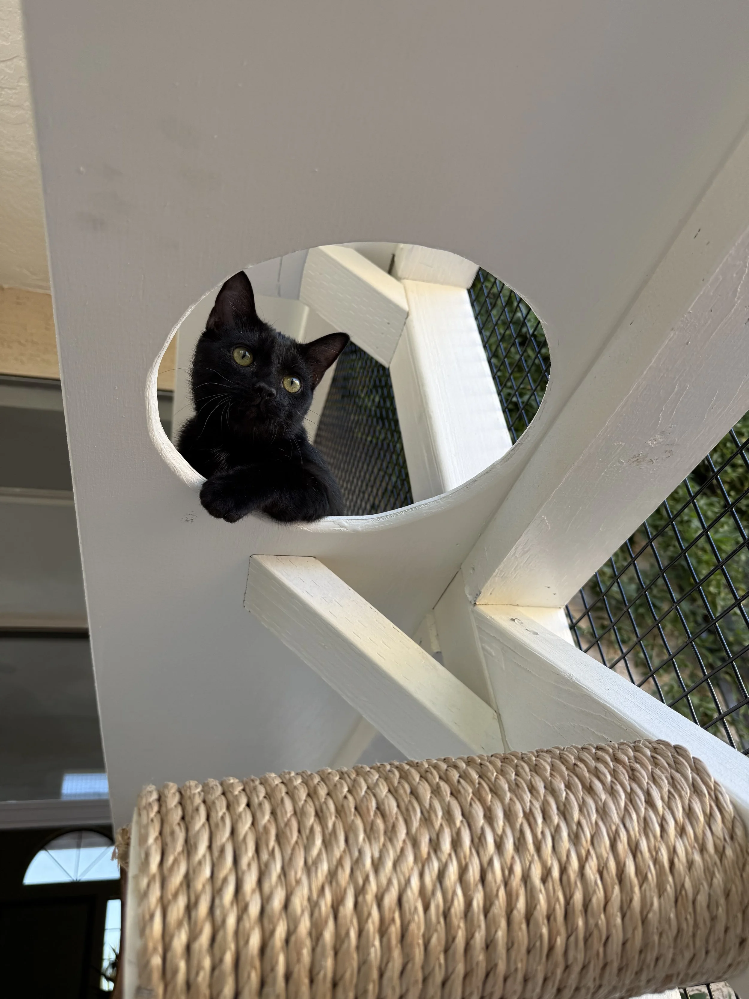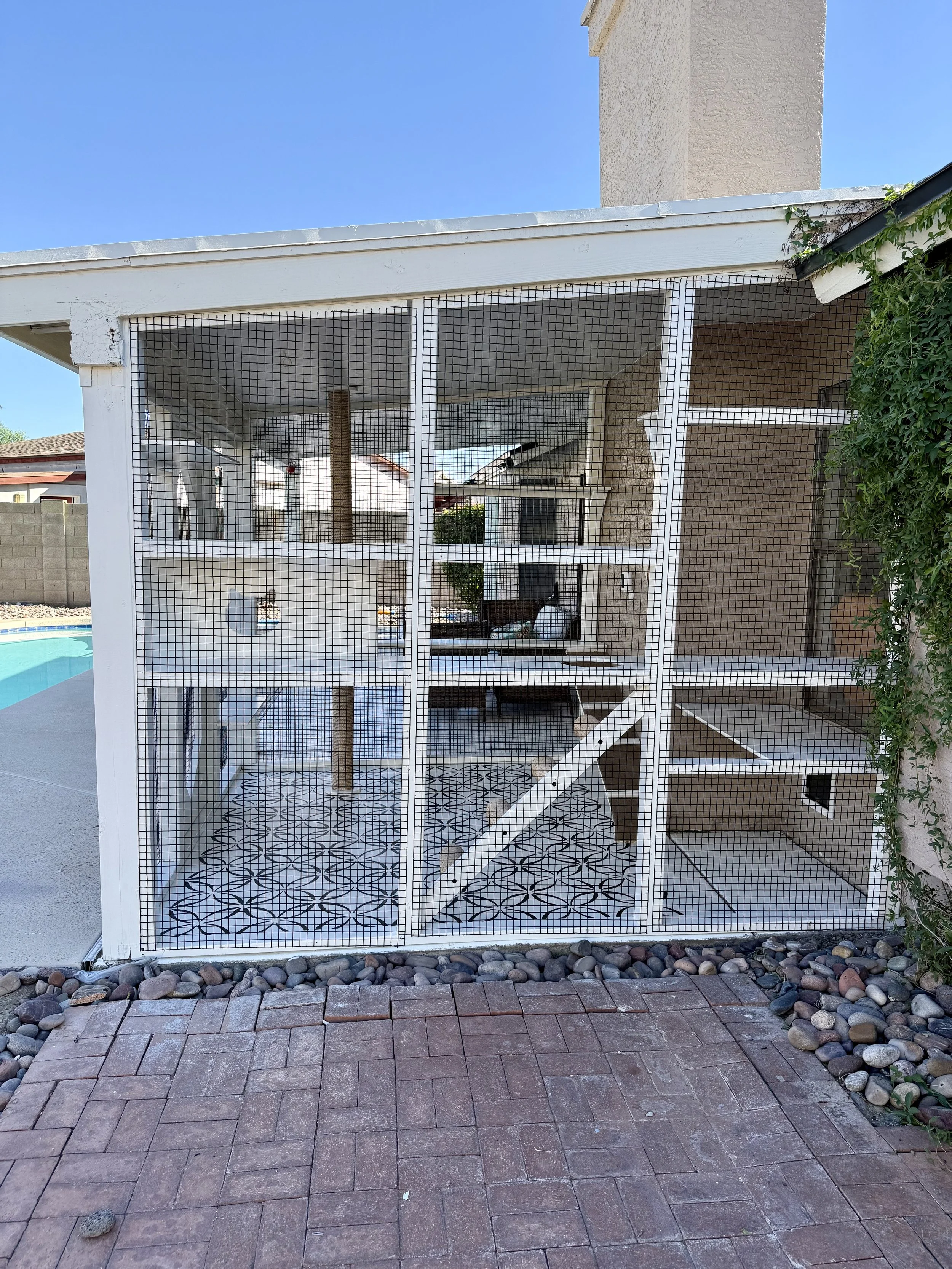This black and white catio was designed for five kitties (and one very lucky pup!). Our client added her own touch with that stunning hand-painted floor. We’re obsessed with how it ties the whole space together. Whether they’re climbing, lounging, or cat walking across their new playground, this crew has it made in their chic pad!